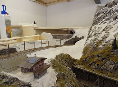 Wie oben auf dem Übersichtsbild vermerkt, wurde die letzten paar Tage auch auf Segment 8 weiter gebaut. Ich habe hier vor allem Gipsarbeiten ausgeführt sowie die Felsen auf diesem Abschnitt gestaltet. Das kleine Berggasthaus wurde "eingegipst" und bereits ein wenig mit gestalterischen Elementen versehen. Einige Stützmauern der Strasse und der Bahntrasse sind ebenfalls entstanden.